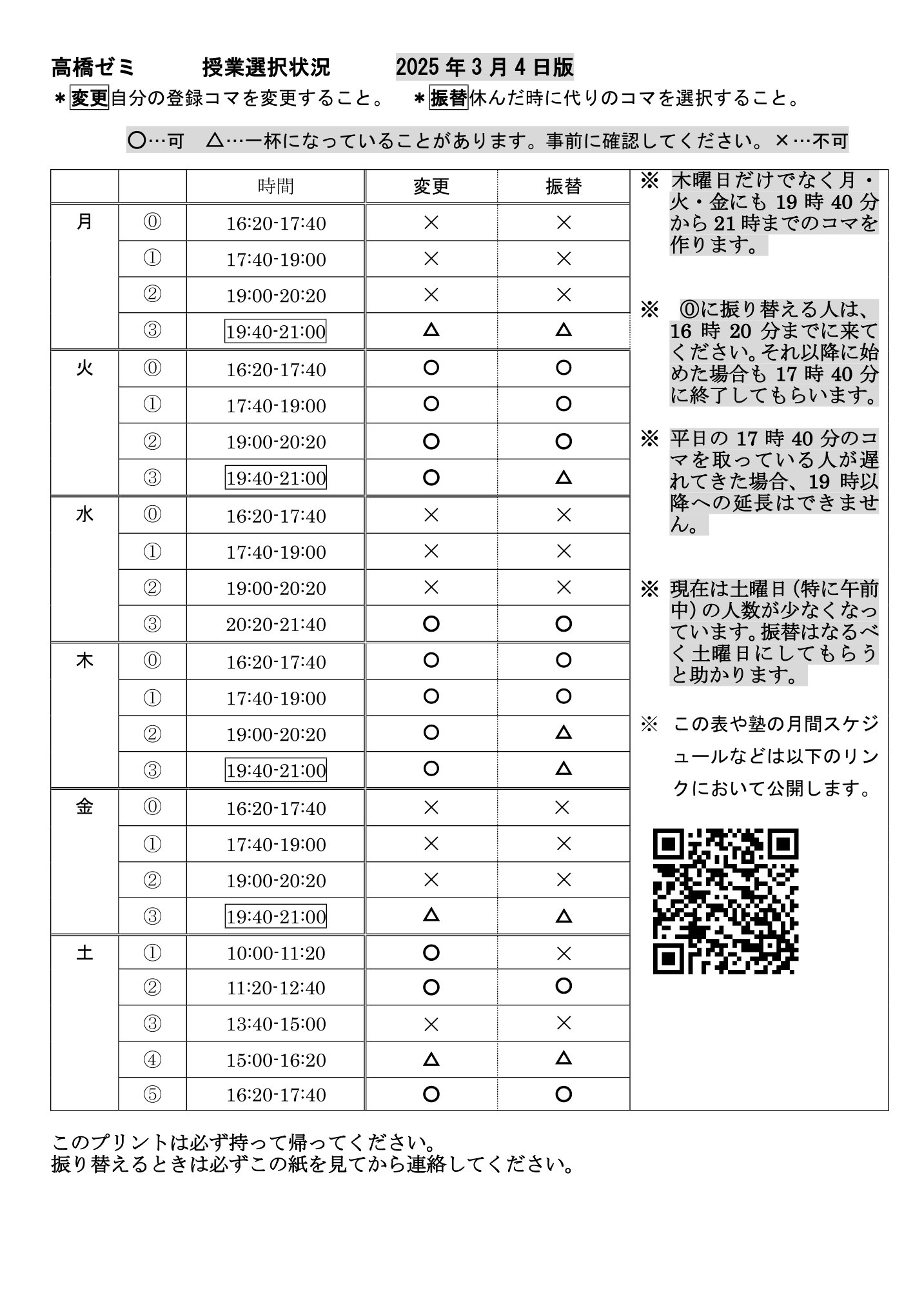 現在、新中1生がたくさん来てくれている関係で、日々マルバツ表が更新されています。現状としては月曜日と水曜日と金曜日の人数が多くなっています。4月にはまた変わってくるとは思いますが、火曜日や木曜日に変更できる人は変更してもらえると助かります。