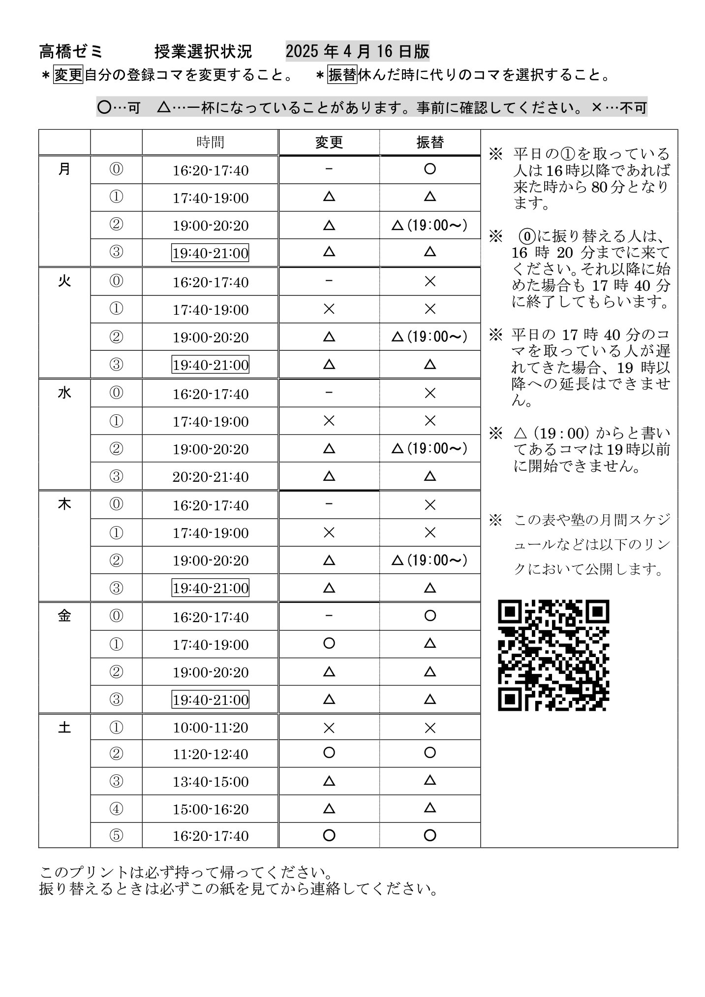 2026年4月16日 / 最終更新日時 : 2026年4月16日 takahashi-zemi マルバツ表を更新します。 今日も変更があります。平日の19時から振替が可能です。 FacebookXBlueskyHatenaCopy