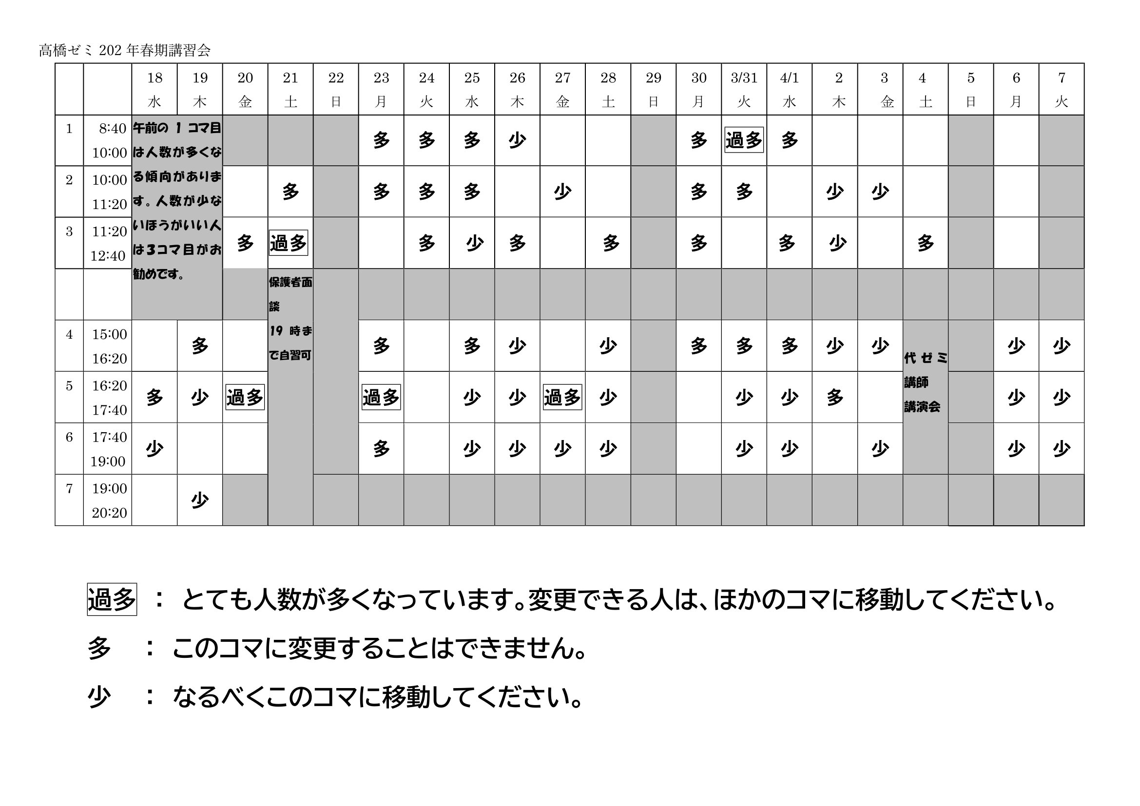 2026年3月18日 / 最終更新日時 : 2026年3月18日 takahashi-zemi 春期の人数の多いコマ 春期講習で人数の多いコマです。「過多」となっているところは変更可能な人は他のコマに変更してください。 「多」となっているところには振替変更できません。変更する場合はなるべく「少」となっているところにお願いします。 FacebookXBlueskyHatenaCopy