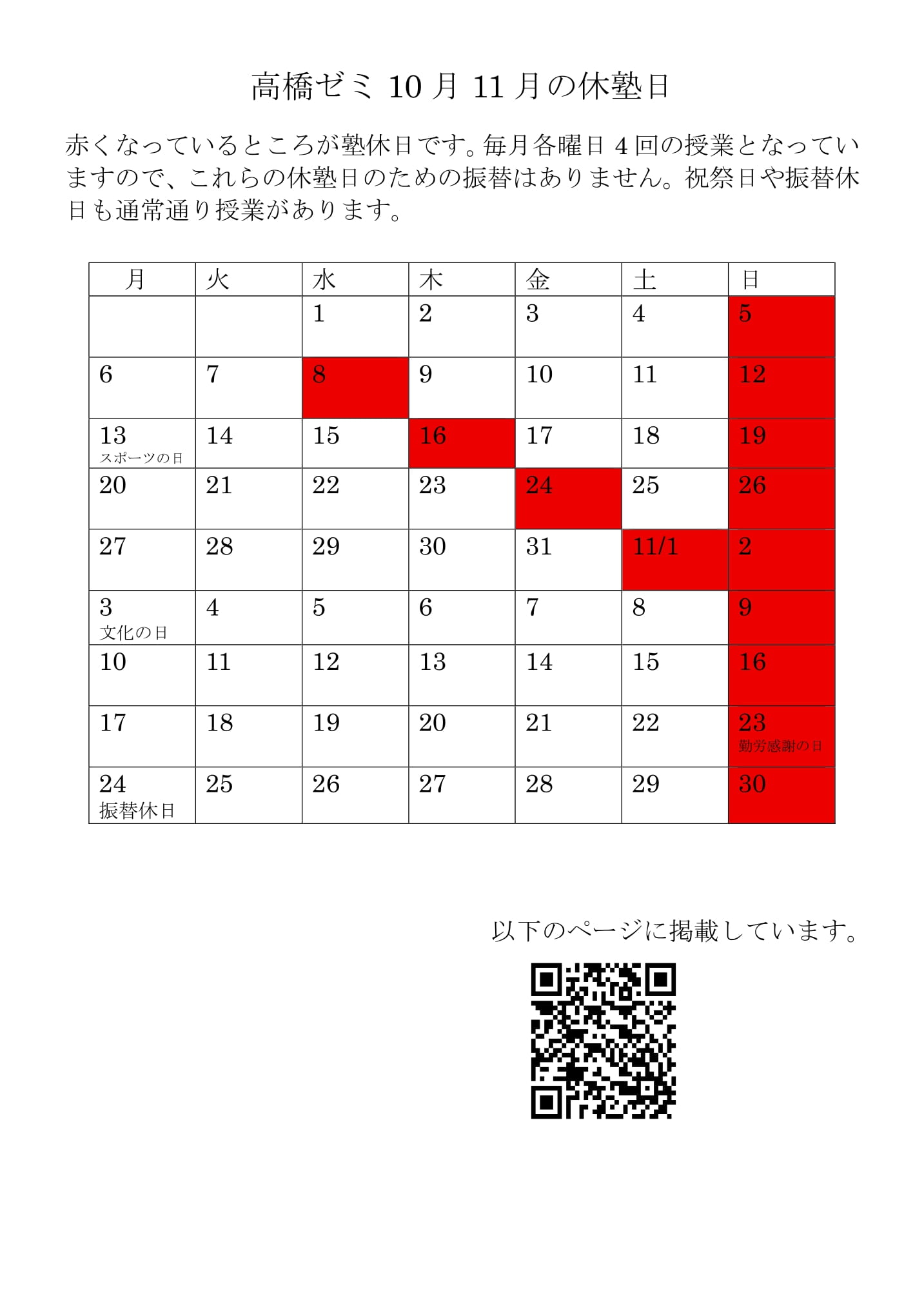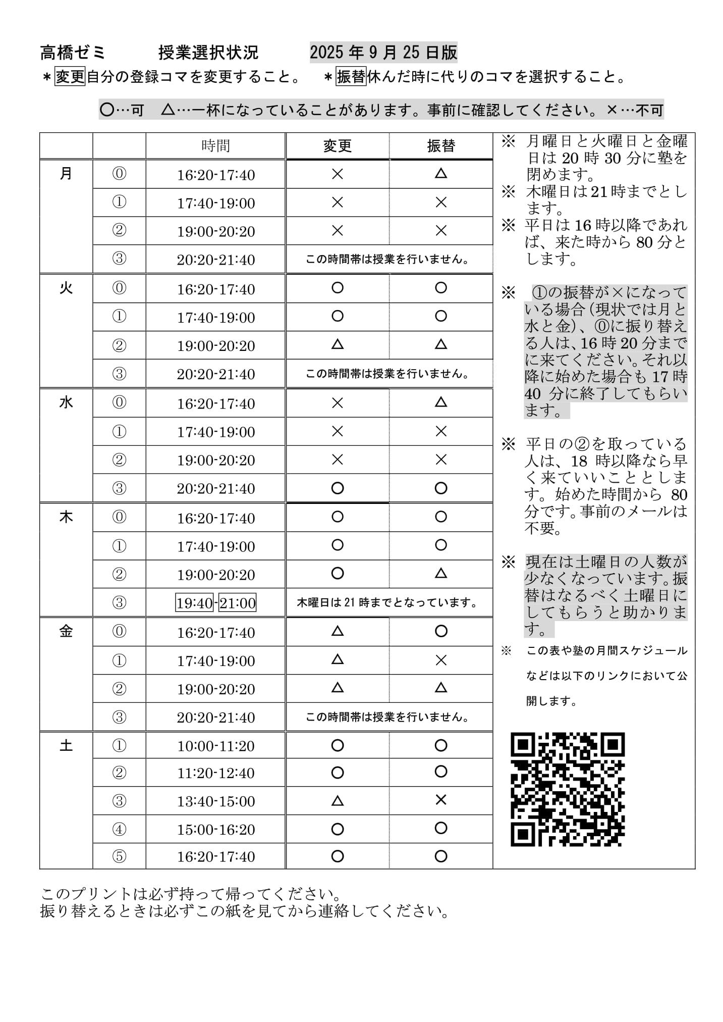 変更振替可能な日程と10月の予定表をアップします。教室でも配布中です。個人ファイルの中に入れていますので必ず持って帰ってください。「高橋ゼミの予定」のページにもアップしています。